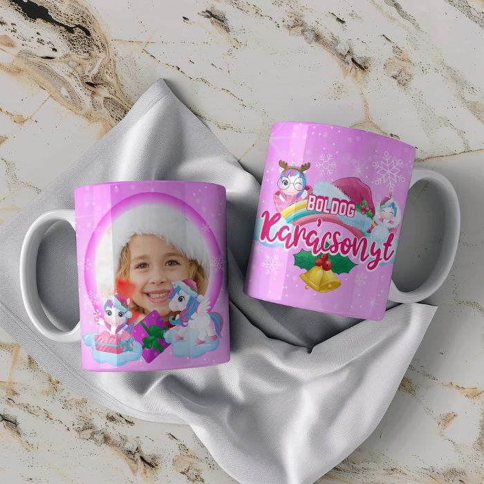 Pónilovas mintával igazán különleges ajándék a pónikat kedvelő gyerekek számára! A bájos világos rózsaszín alapszín és a cuki pónis design minden kortyot különleges élménnyé tesz. A bögrén található egyedi fénykép vagy pónis grafika karácsonyi hangulatot idéz, ami még személyesebbé varázsolja ezt a praktikus ajándékot. Strapabíró porcelánból készült, így ideális mindennapos használatra, legyen szó egy finom forró kakaóról, teáról vagy gyümölcslevesről.